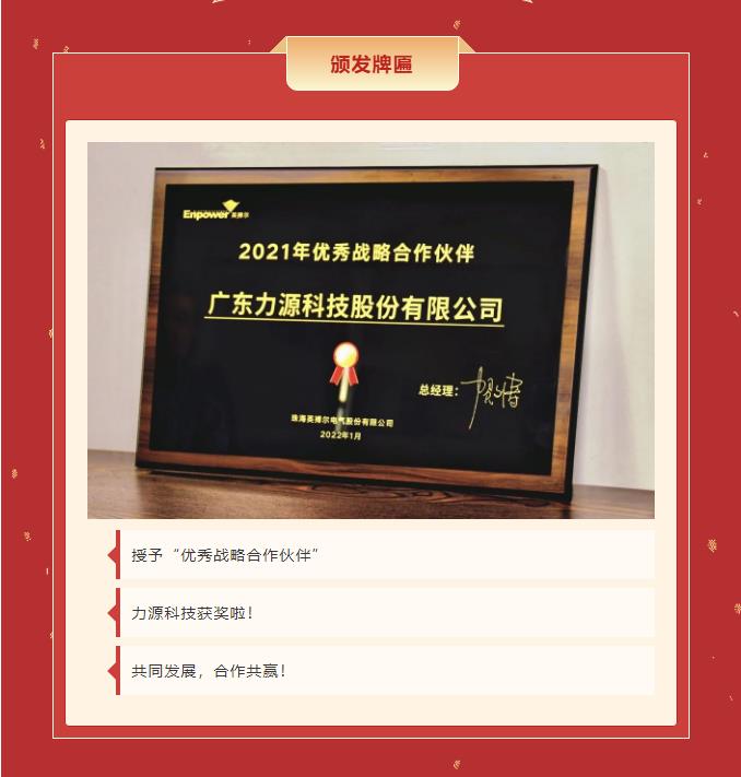 精誠合作,共創(chuàng)共贏丨力源科技榮獲珠海英搏爾“2021年度優(yōu)秀戰(zhàn)略合作伙伴”